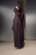 Dress abaya berbahan cupro texture ini menawarkan tampilan elegan dengan karakter jatuh yang lembut dan permukaan bertekstur halus yang terlihat mewah.