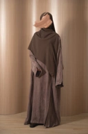 Dress abaya berbahan cupro texture ini menawarkan tampilan elegan dengan karakter jatuh yang lembut dan permukaan bertekstur halus yang terlihat mewah.