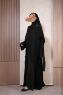 Abaya panjang model open front untuk tampilan berlayer yang elegan