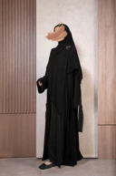 Abaya panjang model open front untuk tampilan berlayer yang elegan