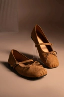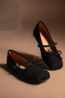 Sepatu ballerina flat ini didesain dengan sentuhan bahan microsuede dan detail pita.