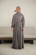Desain dress panjang dengan potongan pinggang yang menyempit dan detail kancing besar